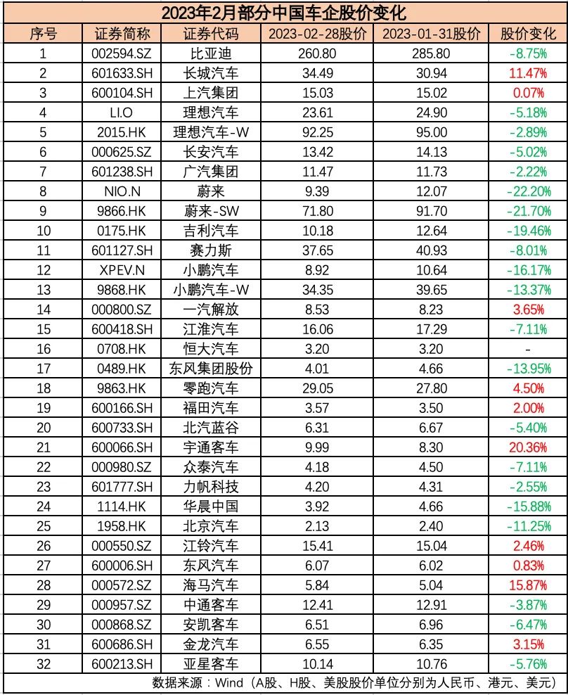 2月,国内整车企业未能延续1月的表现,多数企业进入了回调的状态。在记者统计的32只国内汽车上市公司个股中,除停牌企业外,仅有10只个股实现股价环比增长,这些国内整车上市公司2月市值合计环比减少了1543.46亿元。