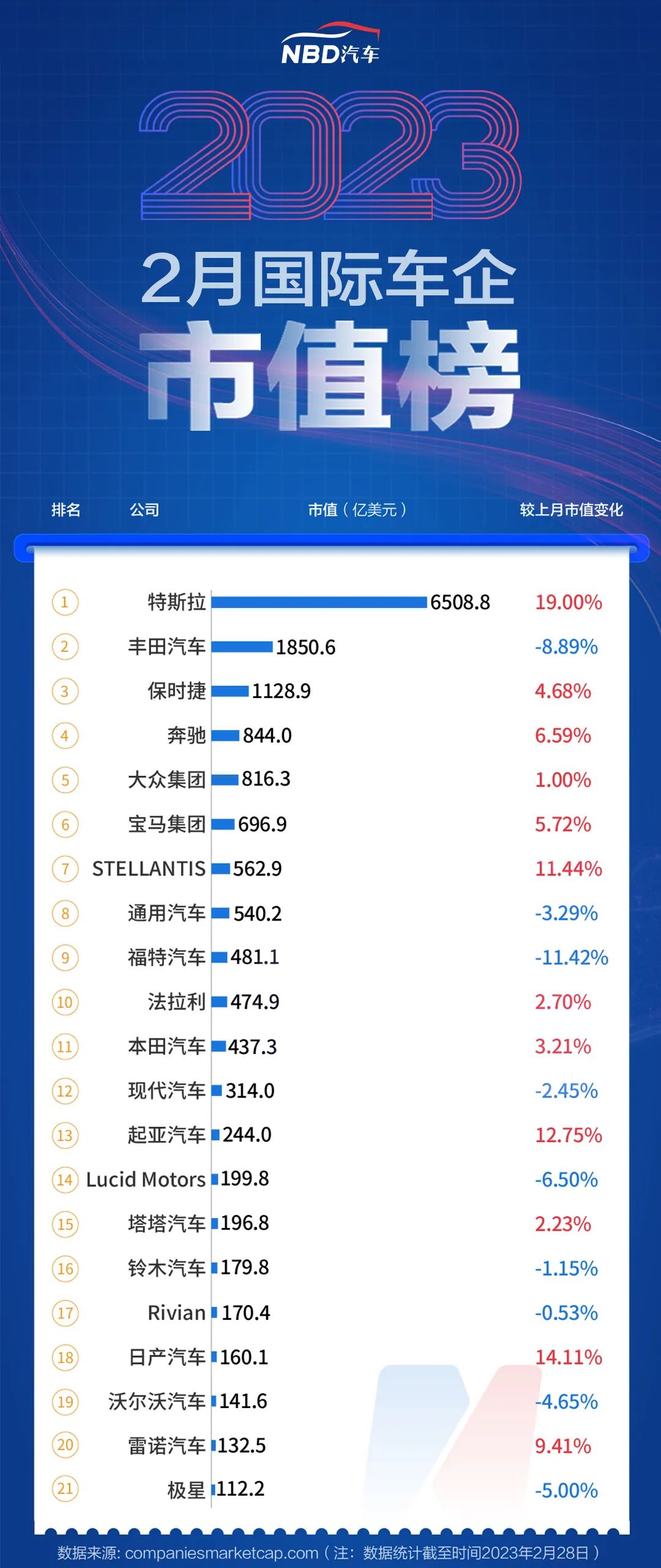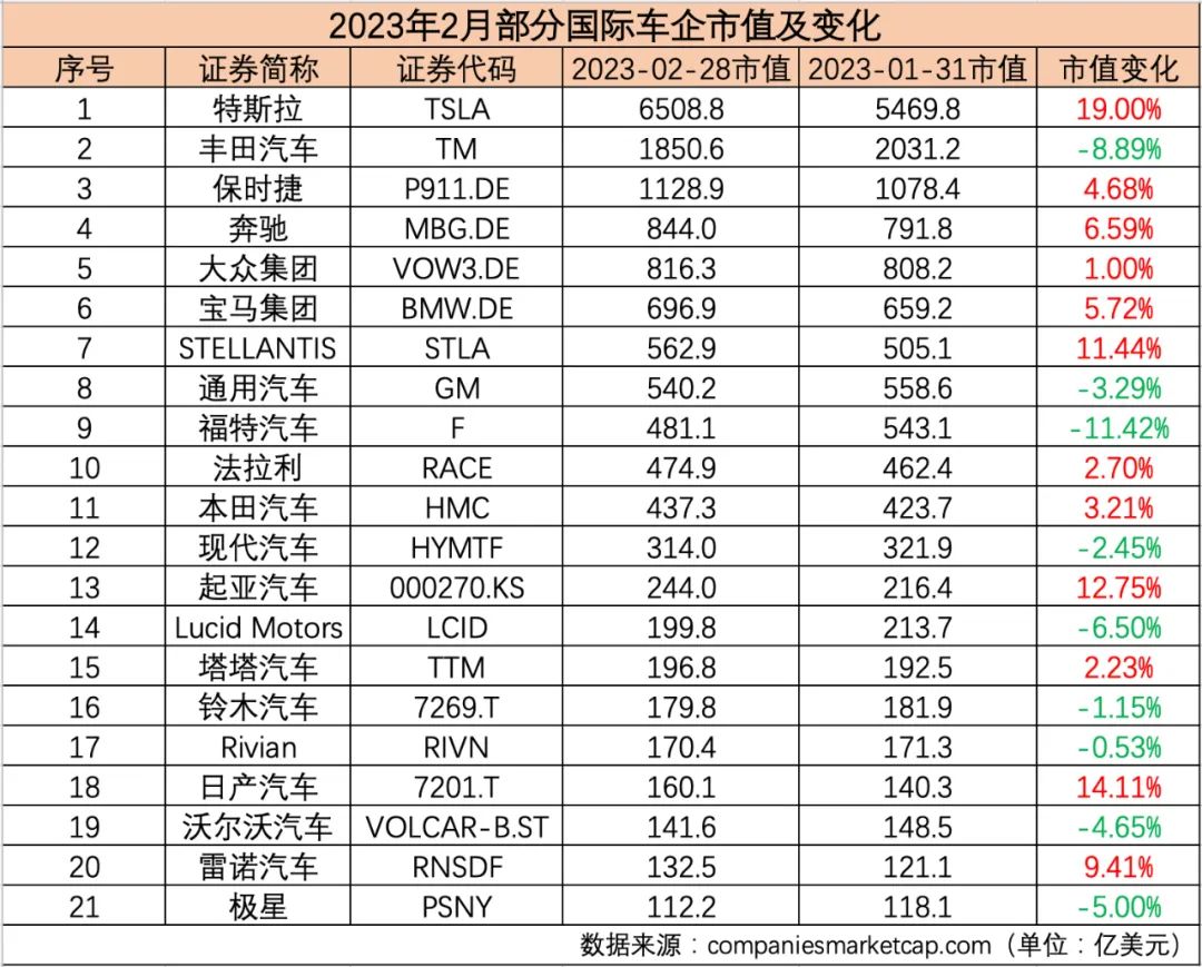 相比1月的全线“飘红”,国际车企2月在资本市场的表现出现分化。21家国际车企中,有12家企业实现了市值的环比增长,占比接近六成。21家国际车企市值合计环比增加1035.9亿美元,比奔驰(MBG.DE,股价82.29美元,市值880.3亿美元)的市值还多。