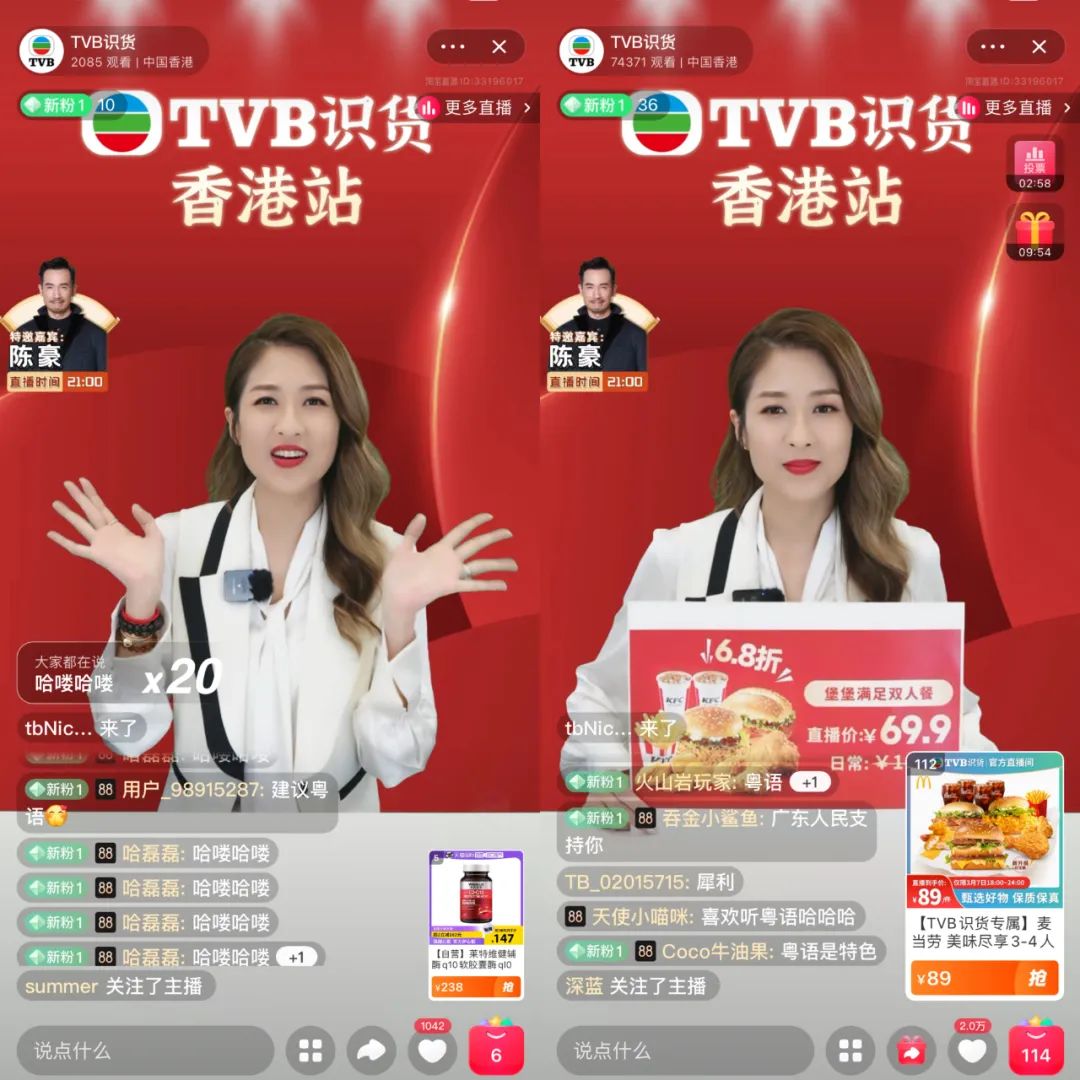 第一,从主播阵容看,在淘宝直播上,TVB试图用更多消费者脸熟的明星打开市场。《天下网商》观察到,在抖音直播间中,TVB日常直播以固定素人主播为主,通常在一口流利的普通话中偶尔穿插几句粤语解说,根据评论区的反馈分批上链接,更接近一个日播品牌直播间。