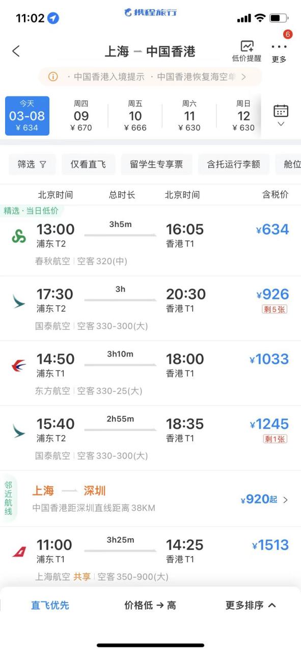 热度爆棚的同时,往来也越来越便利。原先通关需要预约且人员限额都被取消,通关手续更加便利。交通工具的选择上,现在不仅可以乘高铁去香港,机票也非常的便宜,3.8女神节当天,上海飞香港的机票也只要600元左右,而且近期都维持在这个水平。