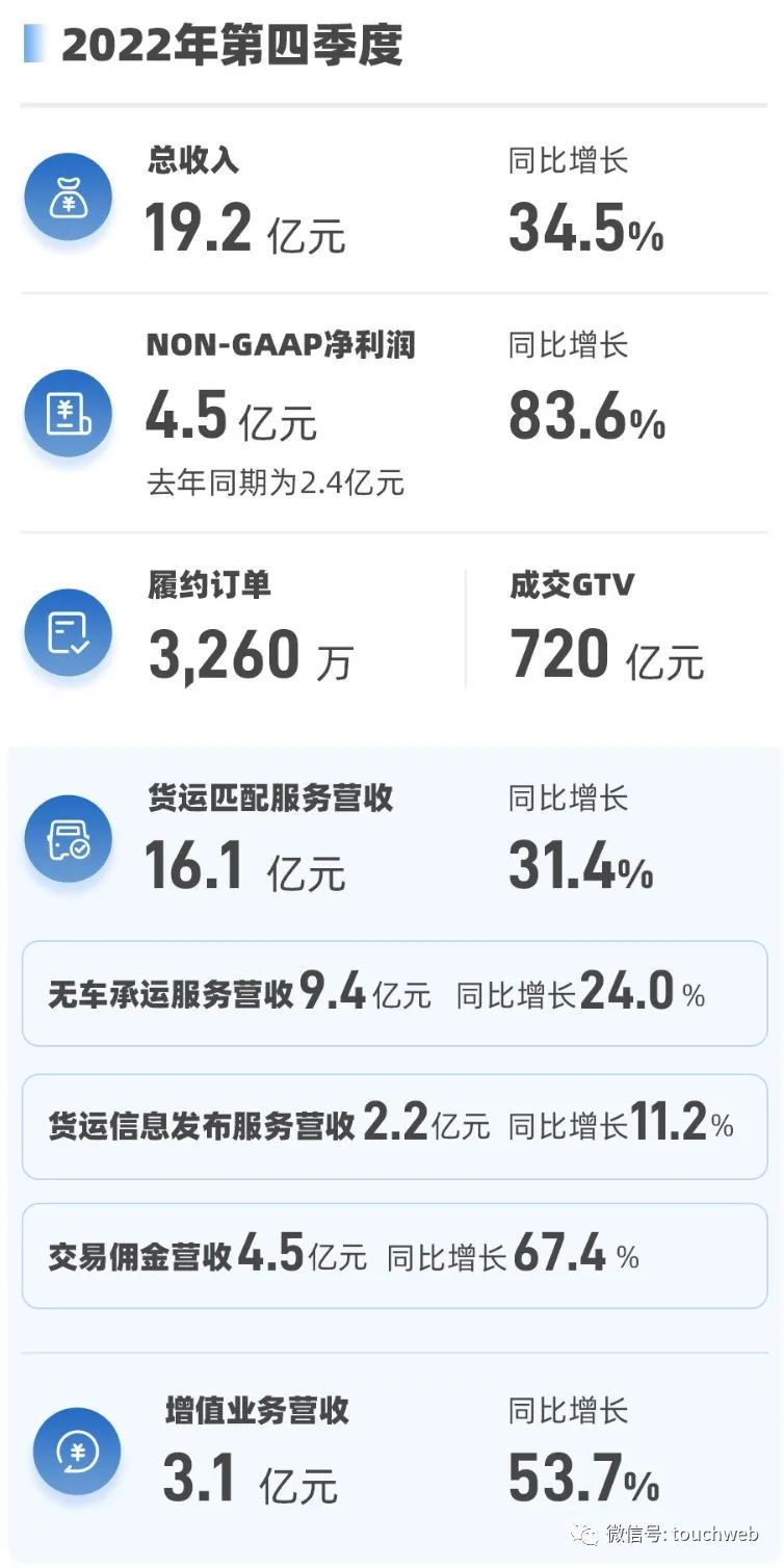 满帮集团2022年第四季营收19.2亿,较上年同期的14.29亿元增长34.5%。