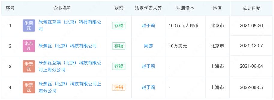 黄菲和赵于莉创业将近两年,共注册了(为方便阅读进行了缩写)①米奈瓦互娱、②米奈瓦科技、③米奈瓦互娱上海和④米奈瓦科技上海这4家公司主体,其中④米奈瓦科技上海已经在3月2日完成注销,①米奈瓦互娱正在注销流程中。