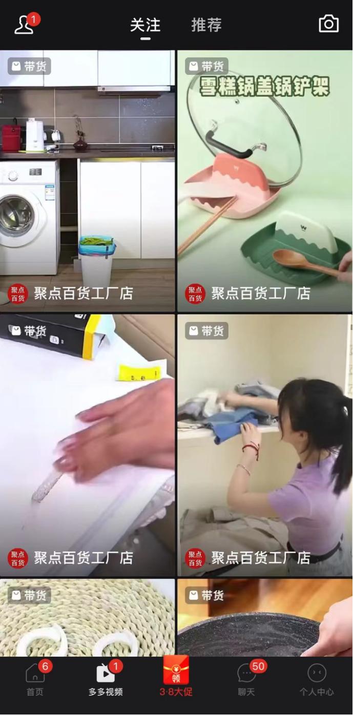 打开多多视频主界面,会发现其设计与抖音其实大差不差,唯一的区别就是只有 " 关注 " 和 " 推荐 " 两个栏目,由于没有搜索框,所以用户能看到什么内容就全靠系统推送。而“关注”栏目下,都是各个品牌或者中小商家的直播,而“推荐”栏目下,是日常搞笑、生活类等各类型视频,连续刷了20条,完全没有广告。这和淘宝、京东满屏的营销广告形成强烈反差。多多视频似乎真的把自己当做一个生活流短视频平台,而不是承载带货功能的电商短视频项目。
