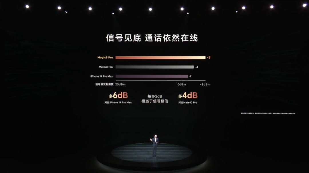 在车库、地下室、高铁、电梯等传统弱信号场景,荣耀 Magic5 系列的信号也能比 iPhone 14 Pro Max 、Mate40 Pro 翻倍提升。