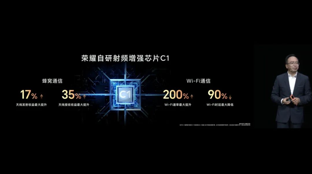 根据荣耀发布会的数据,搭载 C1 芯片后,天线发射收益最大提升 17%,天线接收收益最大提升 35%,Wi-Fi 速率最大提升 200%,Wi-Fi 时延最大降低 90%。
