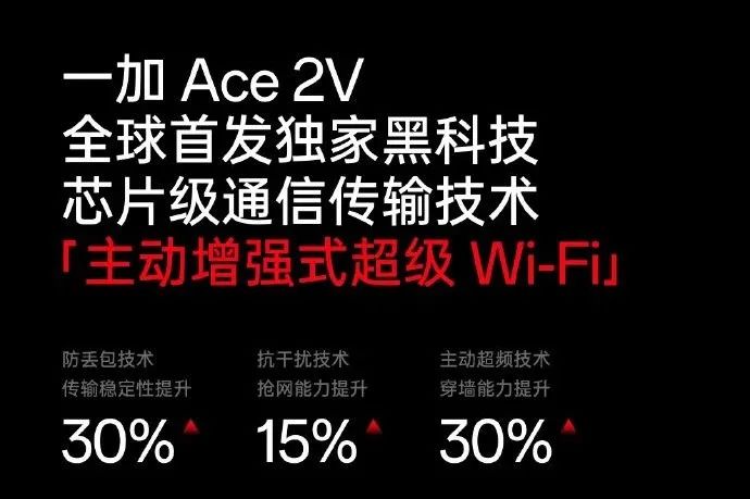 例如最新的一加 Ace 2V 搭载了自研的「主动增强式超级 Wi-Fi」技术,号称是芯片级的通信传输技术,与游戏云计算专网一起,解决弱网环境下的卡顿问题。