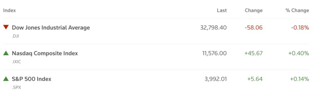 截至收盘,标普500指数收盘上涨0.1%,而道指下跌0.2%。科技股为主的纳指上涨0.4%。