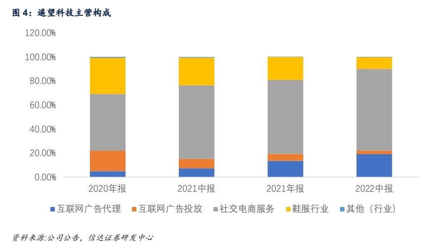 2021年公司业务已经呈二八之分,80%都是互联网广告业务,剩下20%左右才是鞋履业务。2022年上半年,星期六在服饰鞋类行业的营业收入仅有1.76亿元,占比公司总营业收入不过10%。