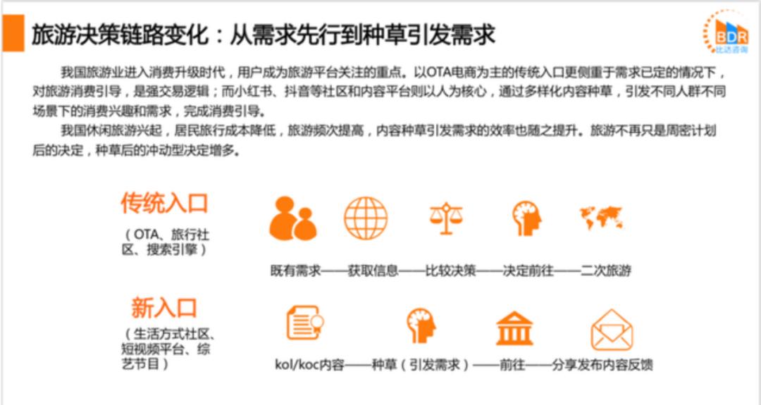 而内容平台新秀们面临的挑战要更现实一些,把内容变交易,在激发用户完成旅游决策之后,通过交易服务完成需求闭环,但中间还隔着系统性、多维度的信息获取,用户心智培养,强大的供应链支持等环节。消费者出游习惯改变和Z世代成为在线旅游用户主力之一,以及传统OTA与上游供应链间复杂的合作关系,下沉市场消费潜力等,对于小红书、抖音类的平台来说却是利于开发的上升空间。
