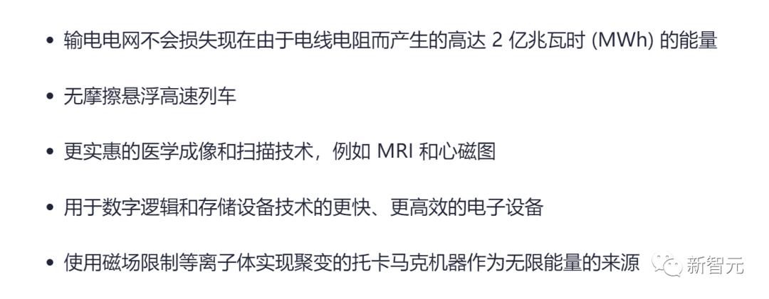 电网在传输电力时,不会像现在那样因电线中的电阻而损失高达2亿兆瓦时(MWh)的能量。
