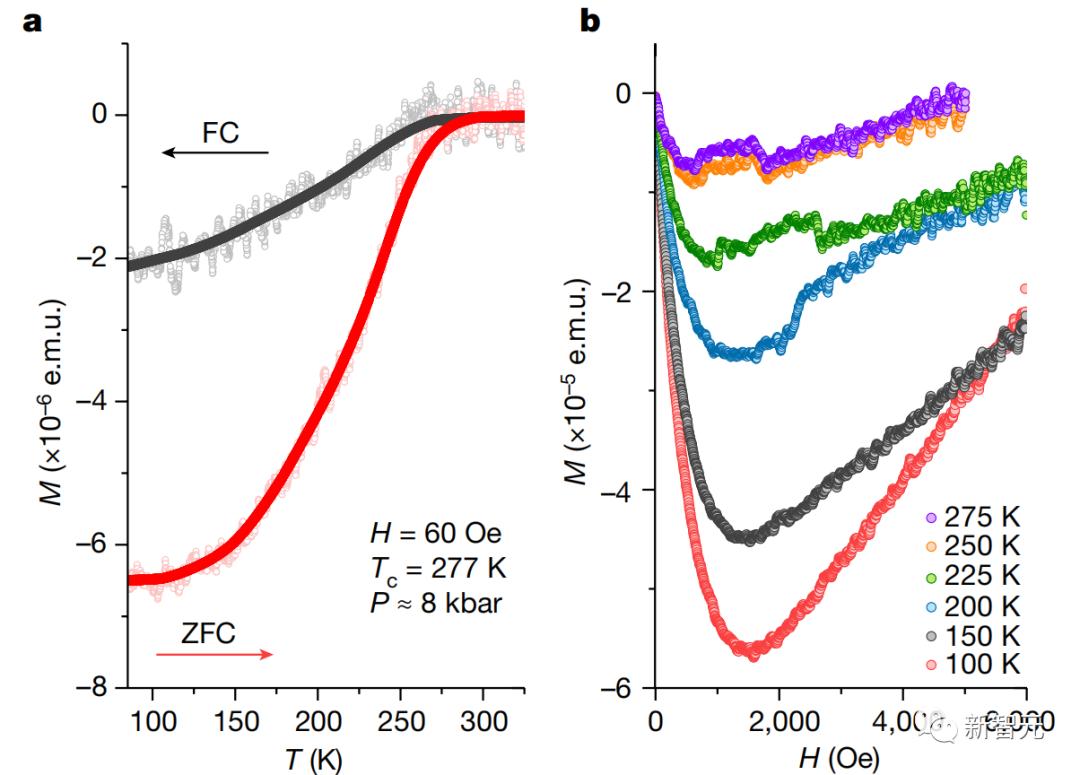 然后通过测量磁场中冷却的迈斯纳效应,证实了超导相的存在。在大约8kbar的277K处观察到明确的迈斯纳效应的开始。M-H的曲线数据采用带VSM选项的PPMS记录。