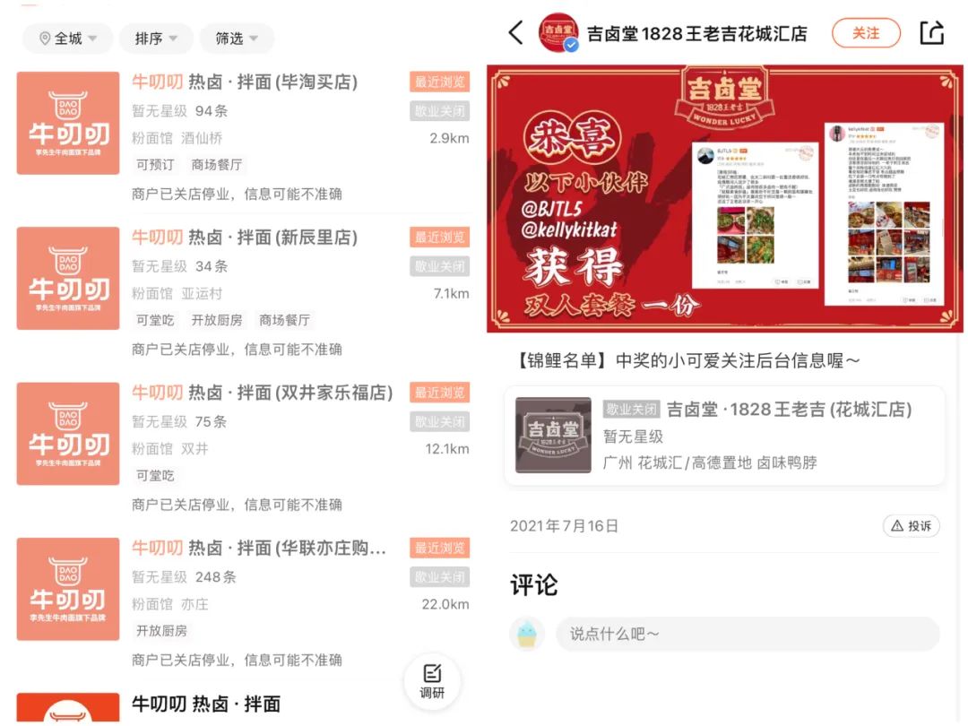 内参君走访了北京市场,昙花一现,一年时间不到,【牛叨叨热卤拌面】北京的五家门店集体关闭,据牛叨叨热卤拌面的前员工说,他早在2022年年初就离开了,牛叨叨也被转手卖掉了;两年前的现在,一家名为【吉卤堂】的热卤小店落座广州,如今早已歇业关停,尽管背后有【王老吉】坐镇。