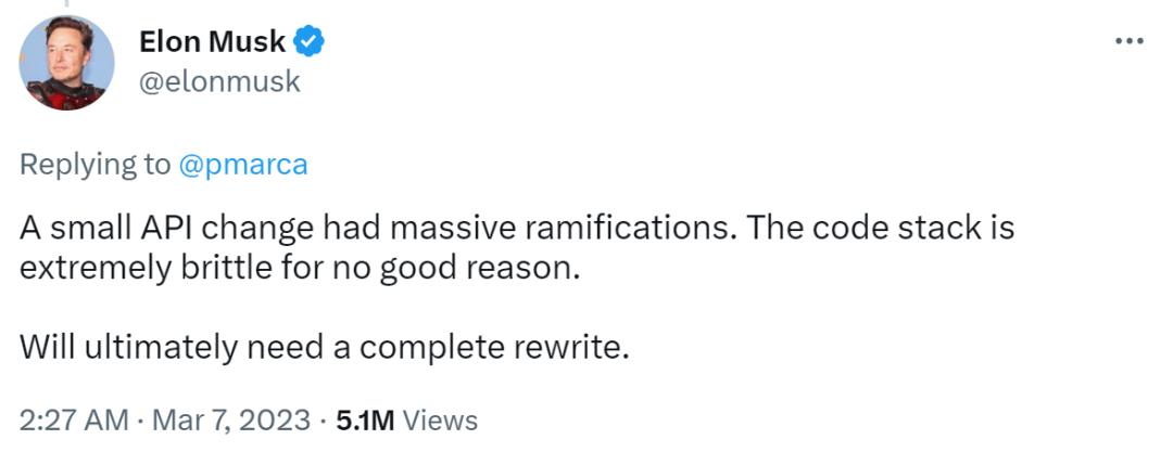 当天晚些时候,他在推特上写道,“一个小小的API变化就能产生巨大的影响”,并表示“代码栈毫无理由地极其脆弱”,“最终需要彻底重写”。