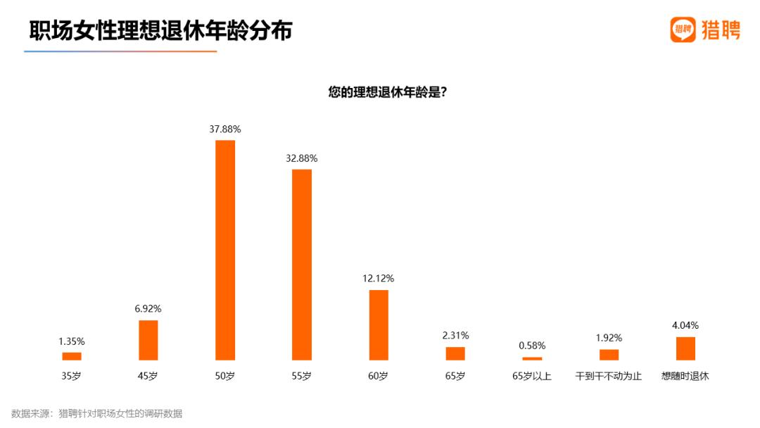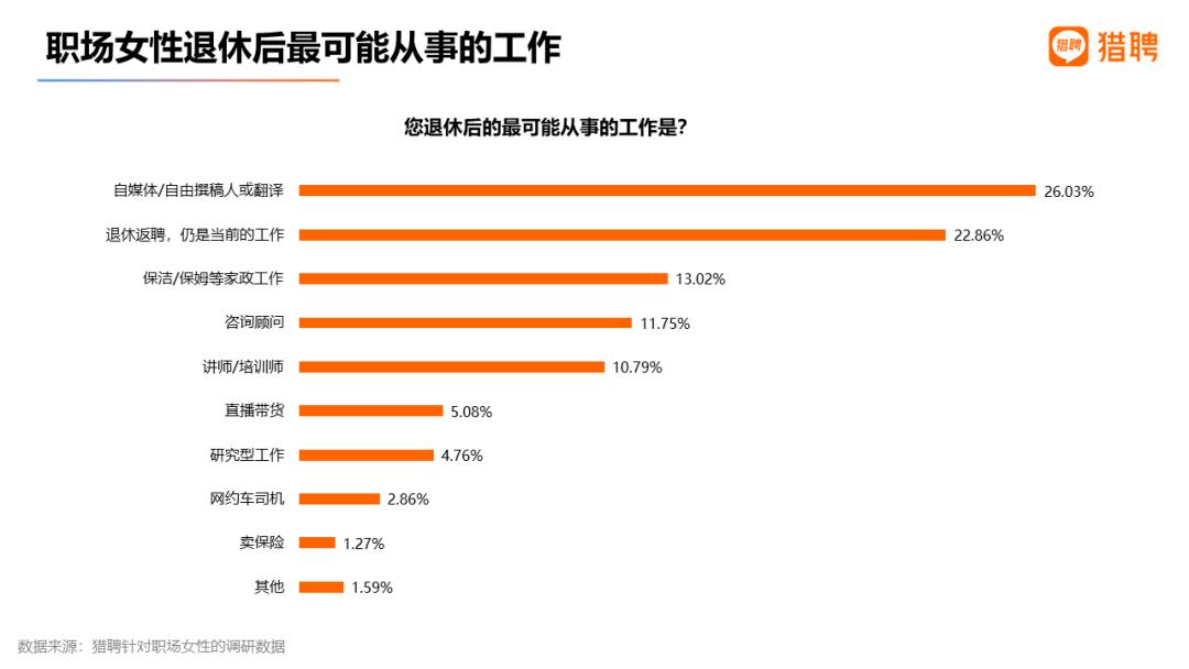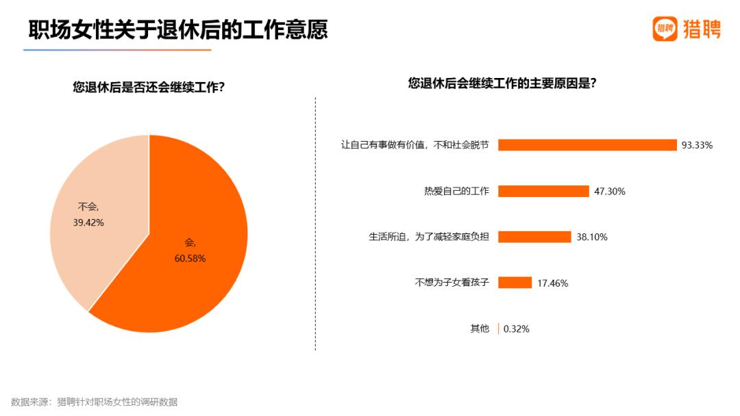 职场女性退休后并非停止工作。猎聘调研发现,60.58%的职场女性表示退休后会继续工作。
