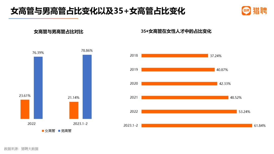 猎聘大数据显示,2022年在所有高管中,女性占比为23.61%;2023年1-2月这一占比为21.14%。在女性高管的年龄分布方面,35+女性有逐年增多的态势。2018年,35+女性高管占比为37.24%;2022年占比为53.24%;2023年1-2月,这一占比为61.84%。由此可见,35+女性在职场上的话语权有所增强。