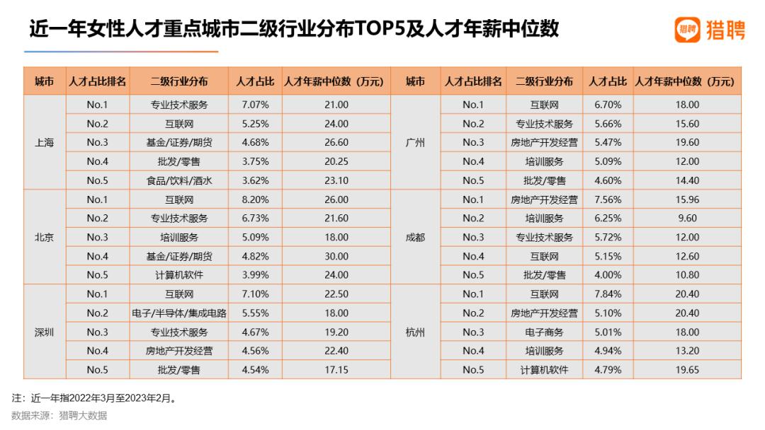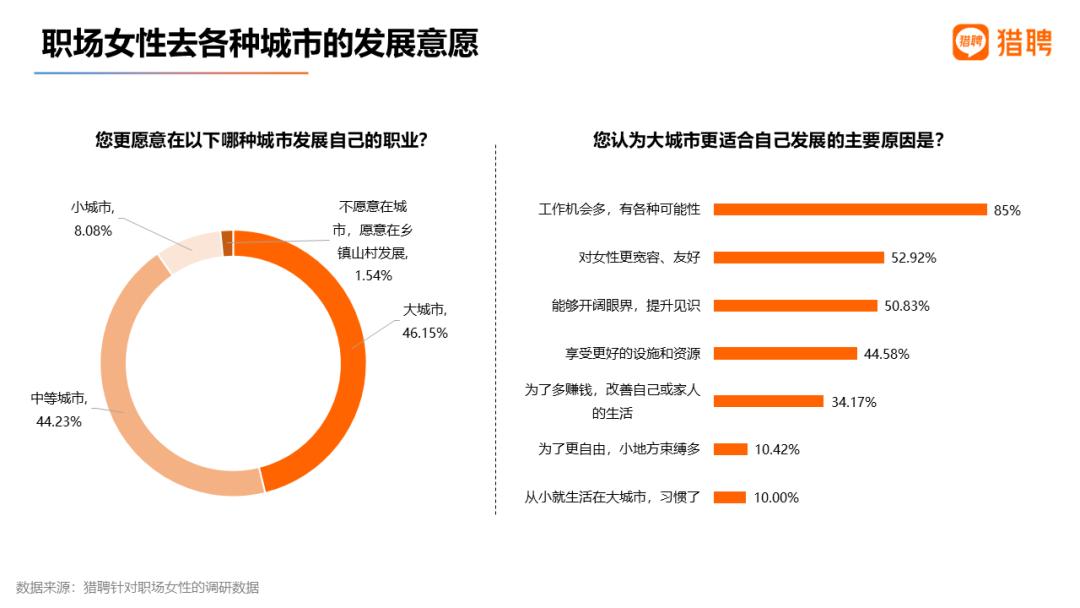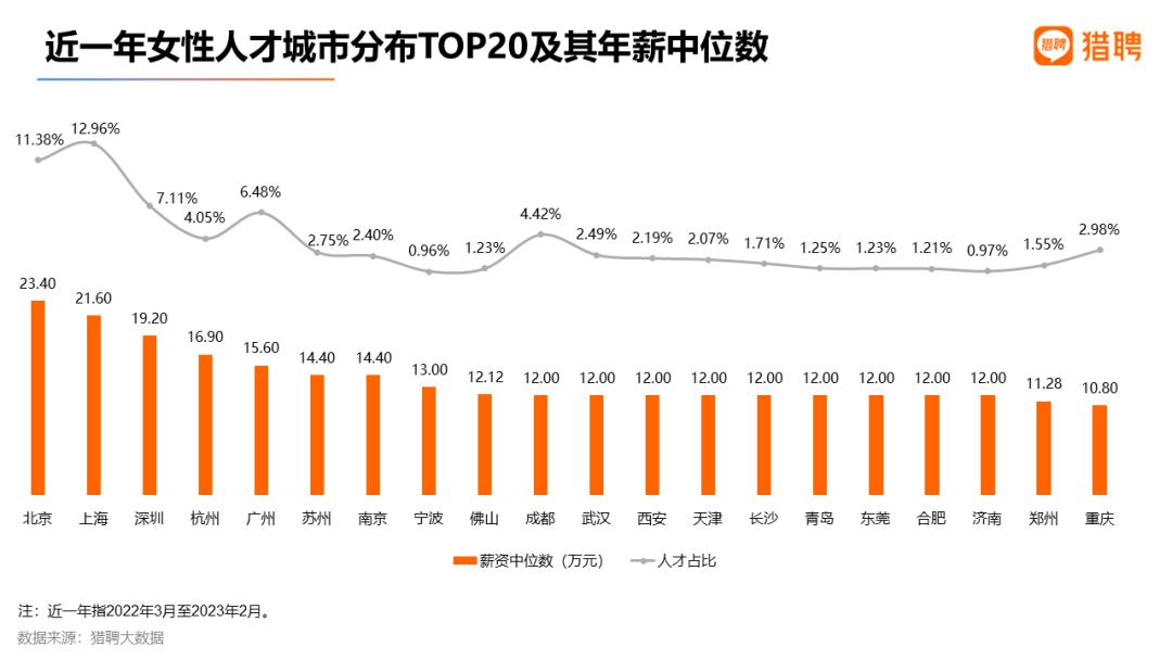 其他城市女性人才占比均小于4%。猎聘调研显示,无论疫情放开前后,薪资福利都是女性择业第一要素。