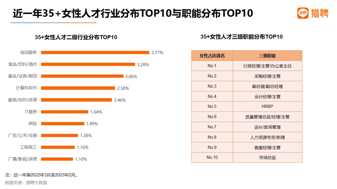 但事实并非如此,猎聘大数据表明,各行各业都有35+女性的身影。从她们分布的TOP10行业来看,培训服务和食品/饮料/酒水位居第一、第二,占比为3.77%、3.28%。专业门槛较高且高薪行业如基金/证券/期货、计算机软件、IT服务行业中35+女性从业者集中度也较高,占比位居第三、第四、第六。