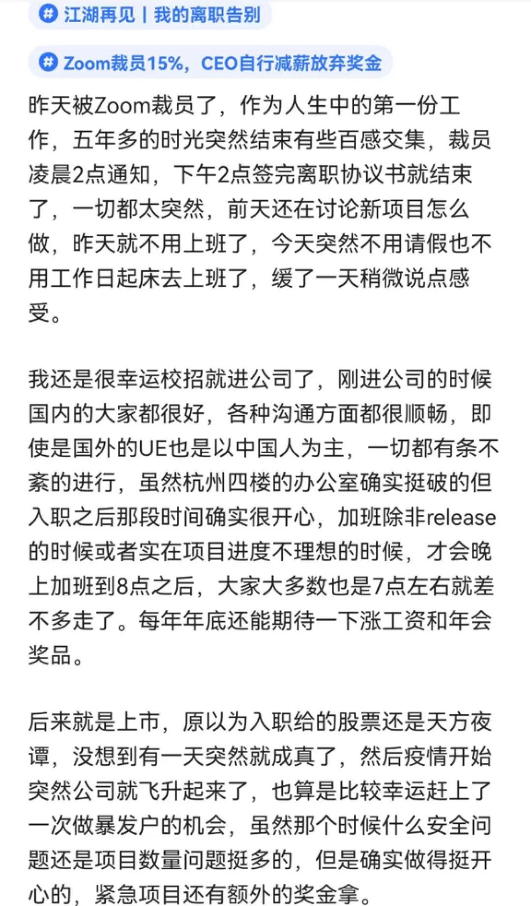 近日,脉脉上“Zoom裁员15%,CEO自行减薪放弃奖金”的话题登上了热榜,即使工作五年的老员工也没有幸免于难,裁员通知和离职协议书的下发甚至都没有间隔一天缓冲的时间。随着疫情的逐步放开,以Zoom、腾讯会议等为代表的云视频会议软件的利用率大幅度减少。随即Zoom开始降本增效,曾经吃到时代红利的人,又因为大环境的改变成为了“无业游民”。