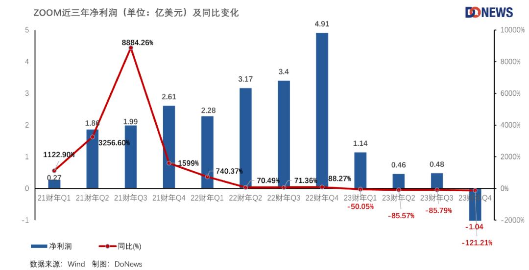 2022财年第四季度,Zoom的净利润达到顶峰4.91亿美元,而仅一年的时间,就亏损超1亿,同比降低121.21%。