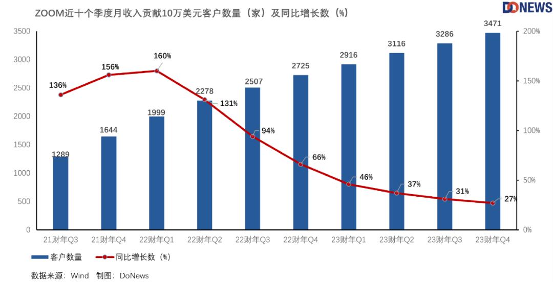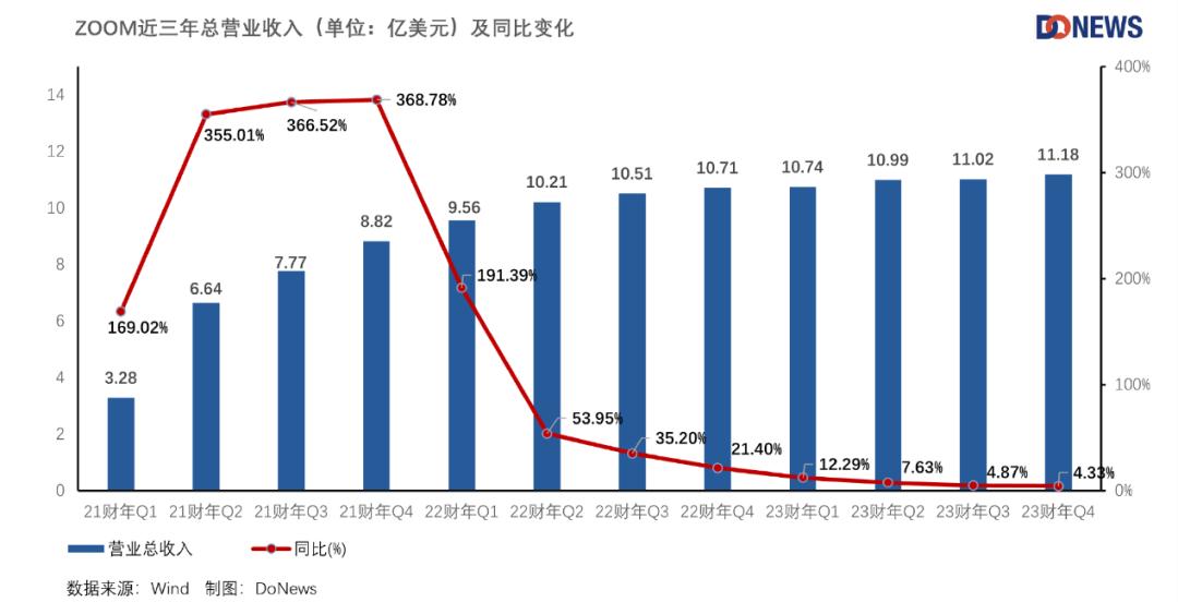 数据显示,ZoomQ4的总营收为11.178亿美元,与上年同期的10.714亿美元相比,仅增长4%,去年同期为21.4%,也低于上一季度4.9%的增速。2023财年,Zoom的总营收为43.930亿美元,与上一财年的40.999亿美元相比增长了7%,但是去年的增速为54.6%。可见疫情渐渐放开后,Zoom的高增长也成为历史。