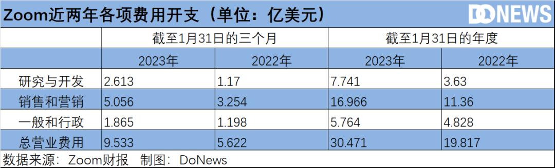净利润暴跌的背后,免不了各项费用支出加大的关系。数据显示,2023财年Zoom总营业费用为9.533亿美元,与上一财年同期的5.622亿美元相比,增长69.6%。