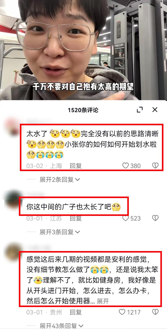 在教大家《如何去健身房》那一期中,不少用户在评论区表示内容太水,广告太长,甚至还有用户直接表示这一期拍得不好。