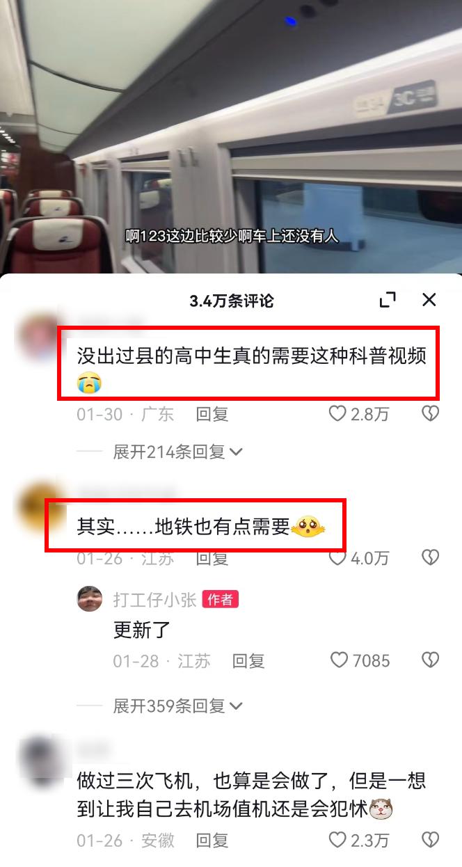 在此前做全职博主一年半的时间里,小张的数据都不温不火,直到今年春节前后,小张在评论区中发现,不少用户都面临着第一次坐飞机、坐高铁的焦虑和无措。