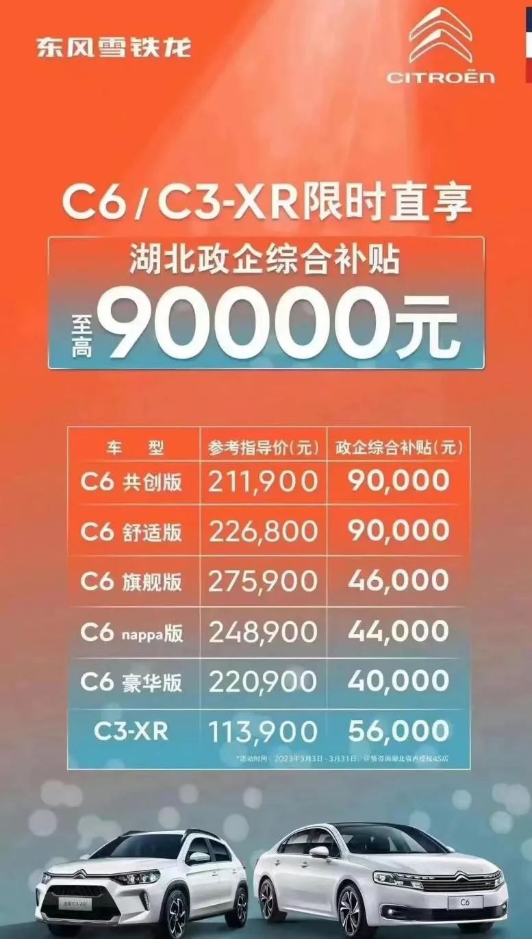 但值得注意的是,此次降价补贴不是直接体现在价格上,如果买车的话,还是得先按照原价来计算,然后会在15天到3个月之内把厂家和政府会将补贴全额返还到账户上。以东风雪铁龙C6为例,先交5000元定金,一个星期内到车,再交23万全款,交完全款后厂家先返4.5万,3个月内湖北政府再补贴4.5万返回原账户,这样落地加上保险大概在14.2万元。