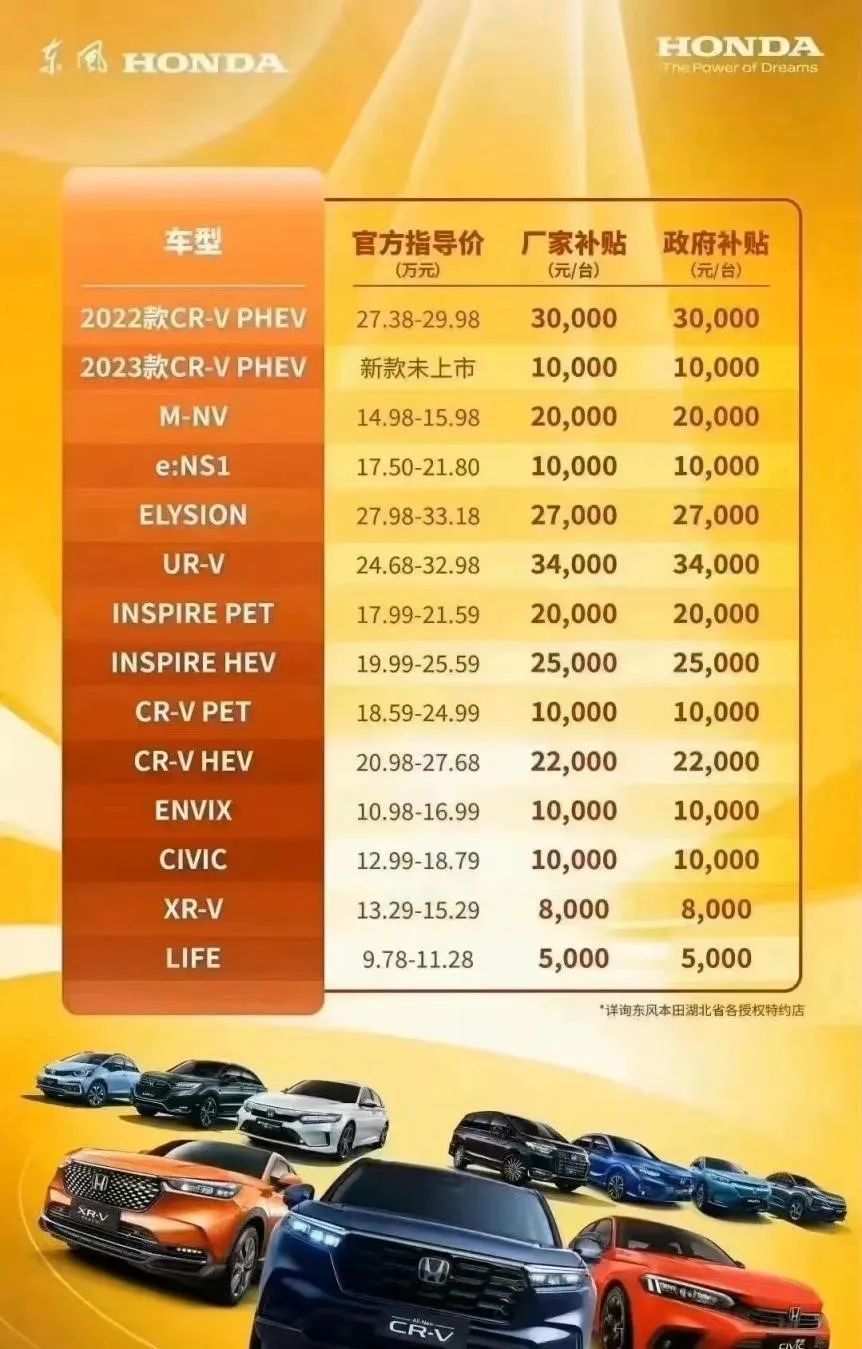 还有颇受消费者欢迎的东风本田系列,旗下的所有车型含补贴至高可优惠6.8万元,其中本田思域补贴2万元,起售价低至10.99万元;英诗派燃油版降价4万元,起售价低至13.99万元,英诗派混动版降价5万元,起售价低至14.99万元,本田艾力绅混动版车型降价5.4万元。