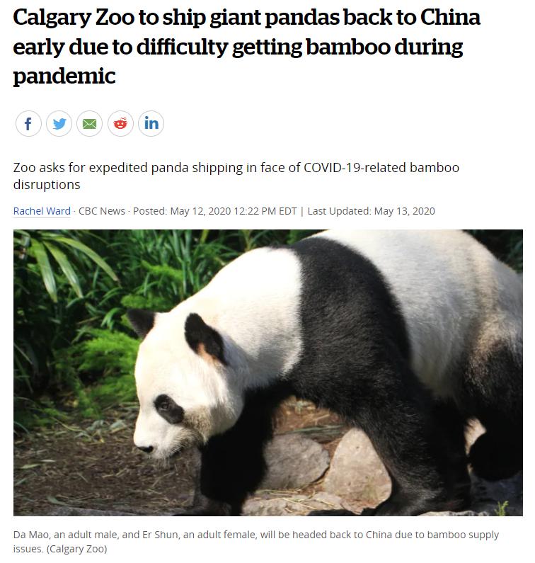 [13]CBCNEWS.Calgary Zoo to ship giant pandas back to China early due to difficulty getting bamboo during pandemic[N].