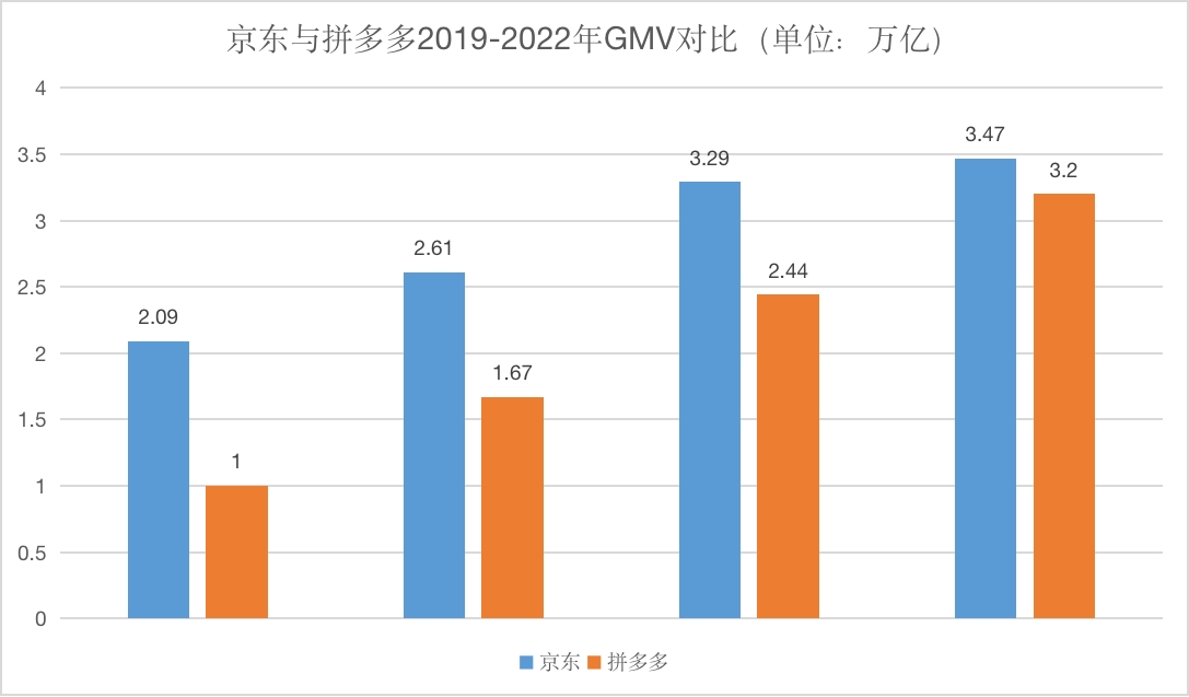 京东与拼多多2019-2022年GMV对比(单位:万亿)拼多多2022年GMV为推测