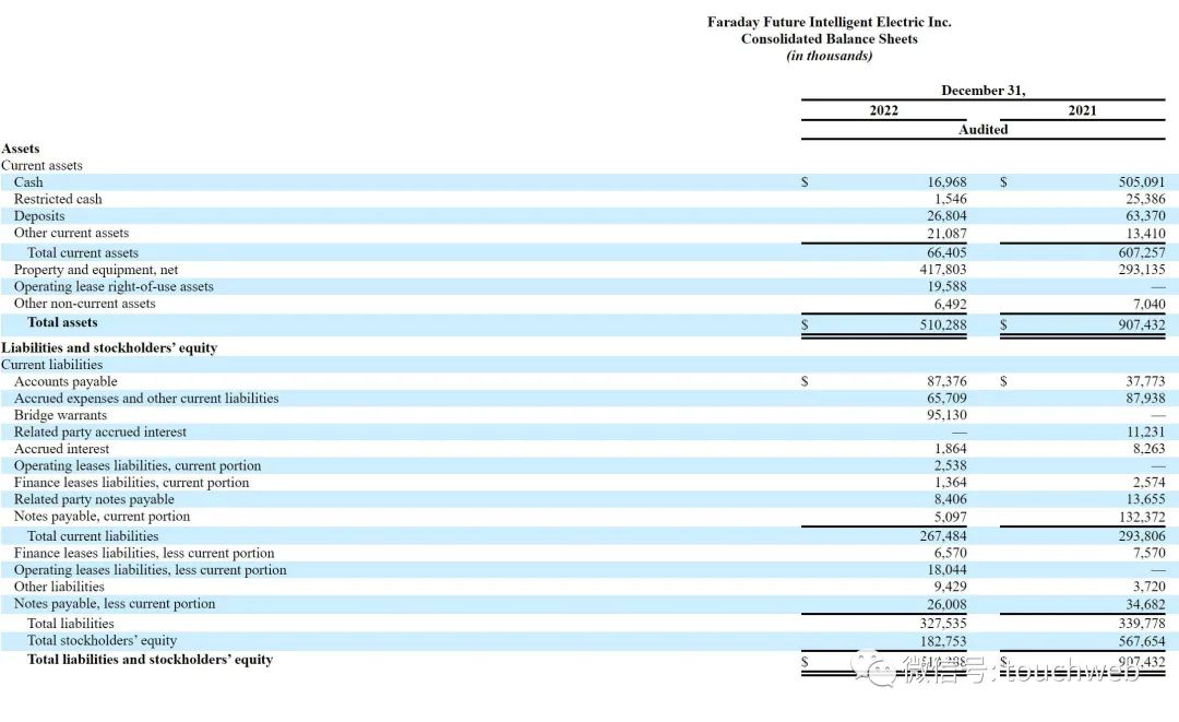 截至2022年12月31日,FF持有的现金为1697万美元,受限制现金为155万美元,资产和设备价值为4.18亿美元,总资产为5.1亿美元;上年同期的总资产为9.07亿美元,其中,上年同期的现金高达5.05亿美元。