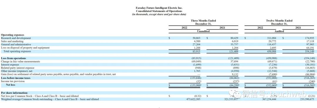FF在2022年第四季度的净亏损为1.54亿美元,上年同期的净亏损为8430万美元;FF在2022年第四季度研发费用为5086万美元,管理费用为2726万美元。