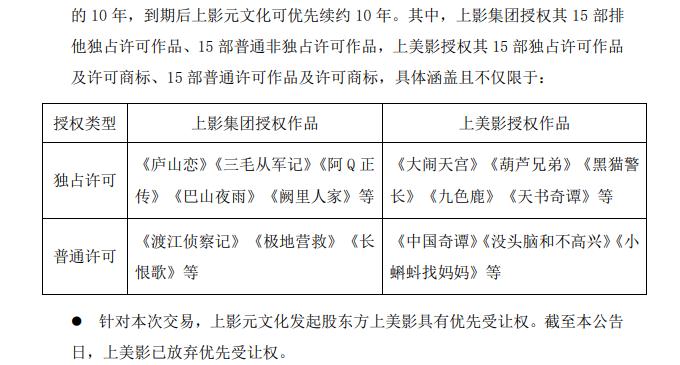 资料显示,上影集团将旗下大部分电影内容IP的独家运营权限打包到新公司, 《庐山恋》《三毛从军记》《阿Q正传》《巴山夜雨》《阙里人家》等 ;而上美则将旗下众多动画IP的独家内容运营打包到新公司,包括 《大闹天宫》《葫芦兄弟》《黑猫警长》《九色鹿》《天书奇谭》等。