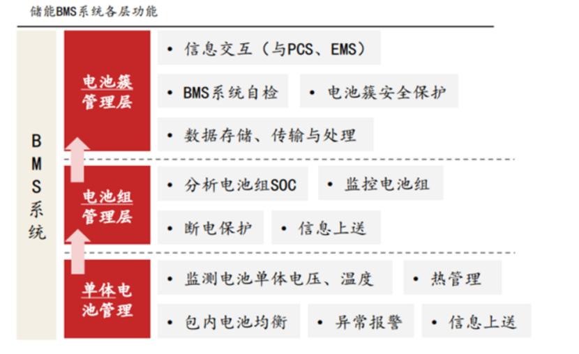 一个完整的储能BMS系统大多都是三层架构,由电池BMS、电池簇 BMS 及电池簇 BMS 组成,从个体电池到整体的电池管理系统。