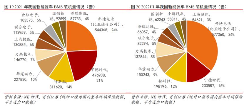 车企与电池厂体量较大,2021年、2022年上半年BMS装机前三为弗迪电池、宁德时代、特斯拉。