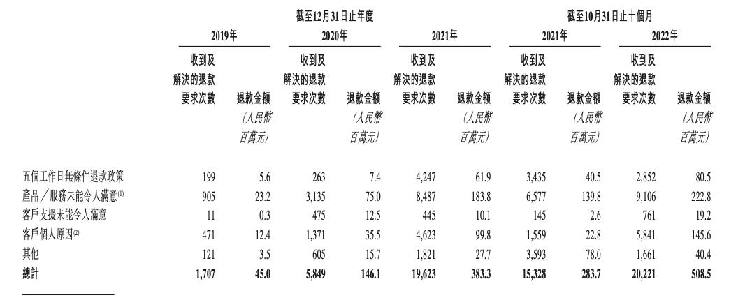 聆讯后的资料集,2019-2021年及2022年前10个月,用户要求九方财富退费的次数分别为1707次、5849次、19623次、20221次;对应的退款金额分别为4500万、1.46亿、3.83亿、5.09亿元。