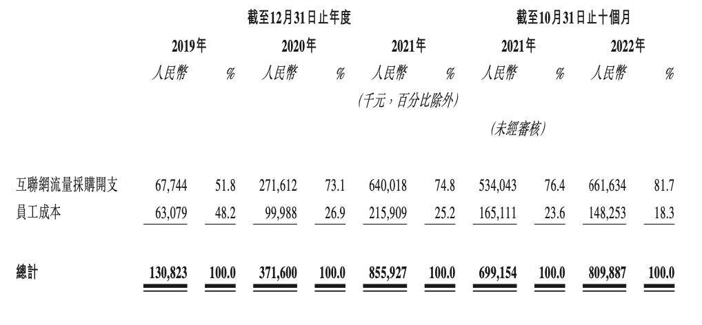 聆讯后的资料集,2019-2021年及2022年前10个月,九方财富的销售及营销开支分别占到总开支的47.7%、52.4%、59.0%、52.4%,费用分别约为1.31亿、3.72亿、8.56亿、8.10亿元。