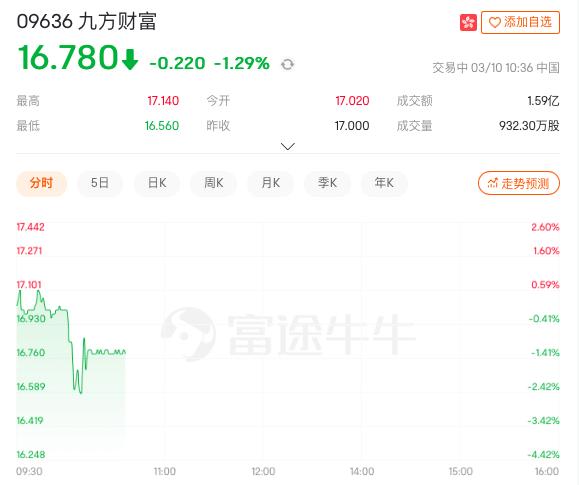 九方财富昨日暗盘收涨4.12%,今日开盘涨0.12%报17.02港元/股。截至发稿,九方财富跌1.29%报16.78港元/股,市值78.16亿港元。