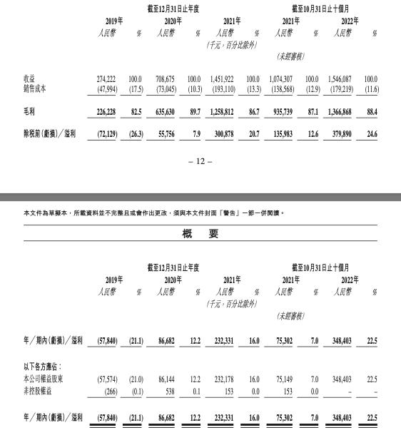 2018-2021年及2022年前10个月,九方财富的收入约为970.1万、2.74亿、7.09亿、14.52亿、15.46亿元;净利润分别为-1054.1万、-5784.0万,8668.2万、2.32亿、3.48亿元。