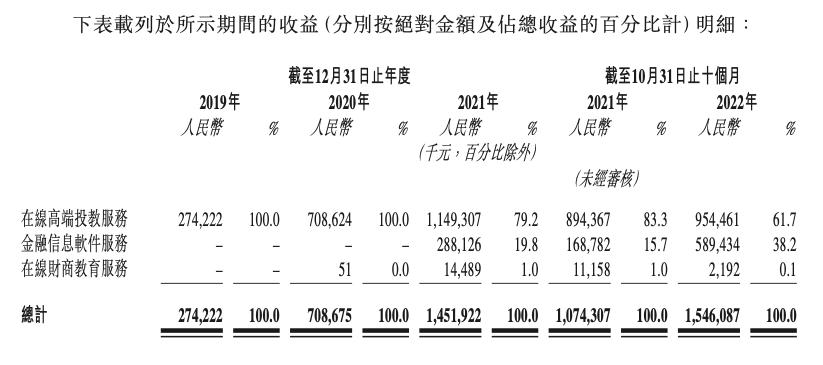 2018-2021年及2022年前10个月,九方财富在线高端投教服务的收入占比分别为100%、100%、100%、79.2%、61.7%。
