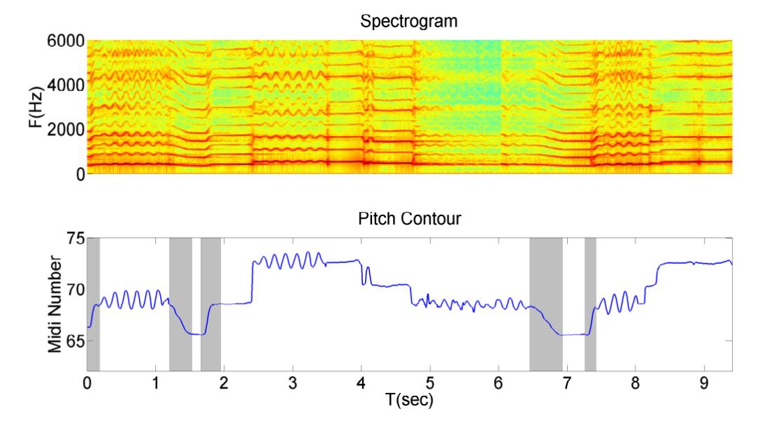 插图:带有滑音的频谱图(上)和音高轮廓图(下),灰色部分是滑音 | 参考文献[4]