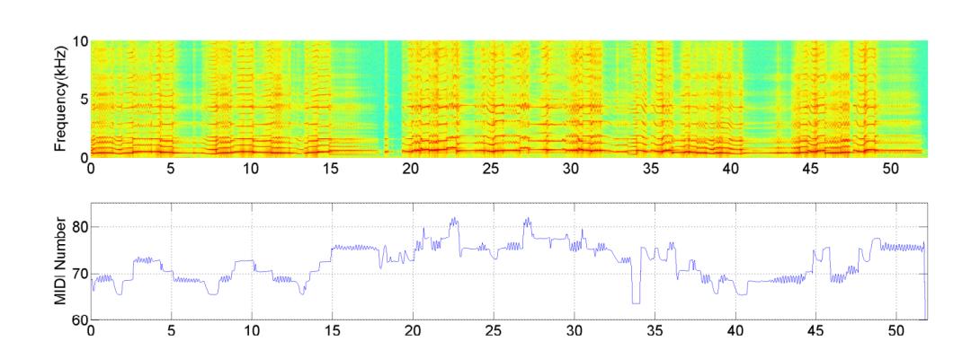 带有颤音的频谱图(上)和音高轮廓图(下),音高线抖动部分为颤音 | 参考文献[4]