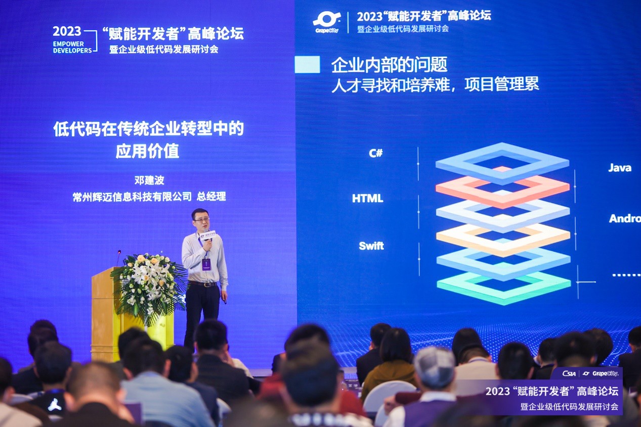 常州辉迈的总经理邓建波先生带来《低代码在传统企业转型中的应用价值》的主题演讲,他表明辉迈这样的传统开发企业会遇到需求变化快、沟通成本高、人才寻找和培养难等诸多内外部挑战,也分享了使用葡萄城活字格产品统一内部开发平台、降低开发门槛、缩短人力成本、提高开发效率的成功实践案例。
