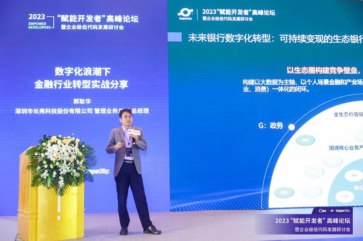 在此次高峰论坛上,深圳市长亮科技管理业务部总经理郭耿华先生带来《数字化浪潮下金融行业转型实战分享》,让大家看到了连接多元场景,联合经营与数字化运营的生态银行模式,而长亮科技多年来在金融数字化领域的深入实践,也给与会嘉宾提供了数字化转型的系统性思路和落地路径。