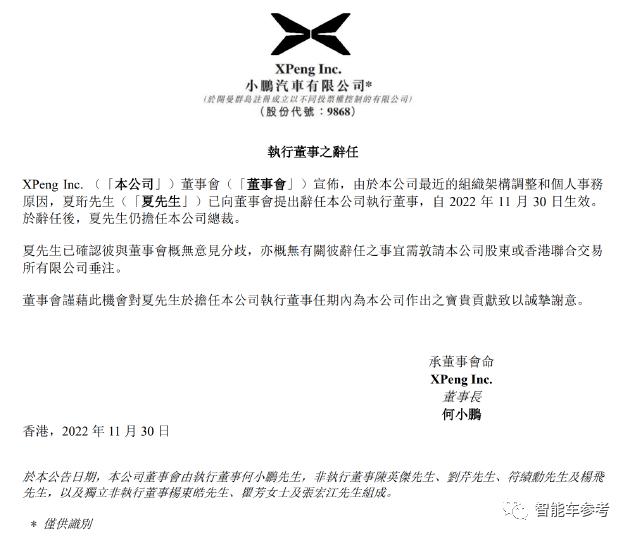 去年11月,小鹏汽车公告称夏珩辞去公司董事会执行董事职务。