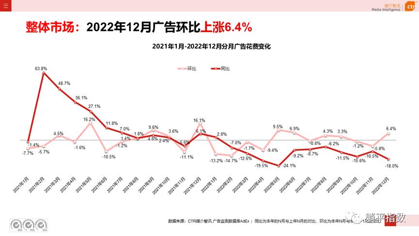 在中国,广告行业是一个存量竞争非常激烈的市场,根据CTR数据显示,2022年全年国内广告市场投放规模同比减少11.8%。分媒体来看,传统户外、报纸、影院视频广告收入明显下滑,电视、电梯、互联网广告虽有波动但表现强韧。分月份来看,开年以来市场持续下滑,环比降幅较明显,下半年整体市场有明显的回升迹象。