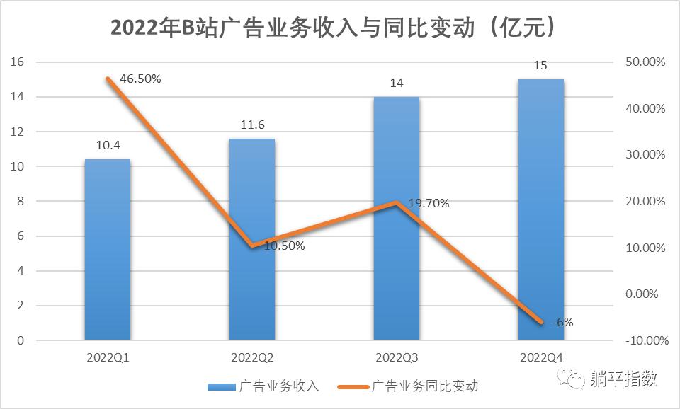 2022年全年,B站的广告收入有50.7亿元,同比增速为12.2%;分到每个季度来看,除了第四季度出现同比6%的下降之外,其余每个季度都有不同幅度地同比上升。尽管相比增值服务,广告业务的同比增速并不大,不过放到整个广告行业里看,这样的成绩是值得肯定的。