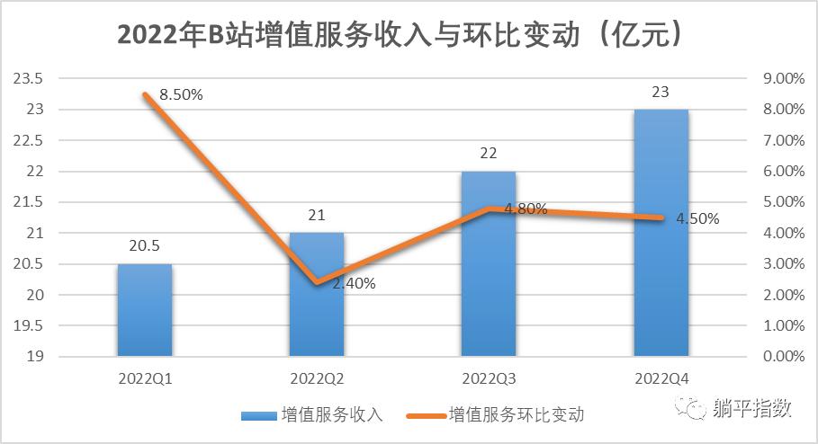 2022年,B站的增值服务收入为87.2亿元,同比增加25.6%,是B站全年增幅最大的业务板块;按季度来看,全年每一个季度该业务都实现了同比增长,也是B站唯一一个在2022年每个季度都保持一定同比增幅的业务板块。