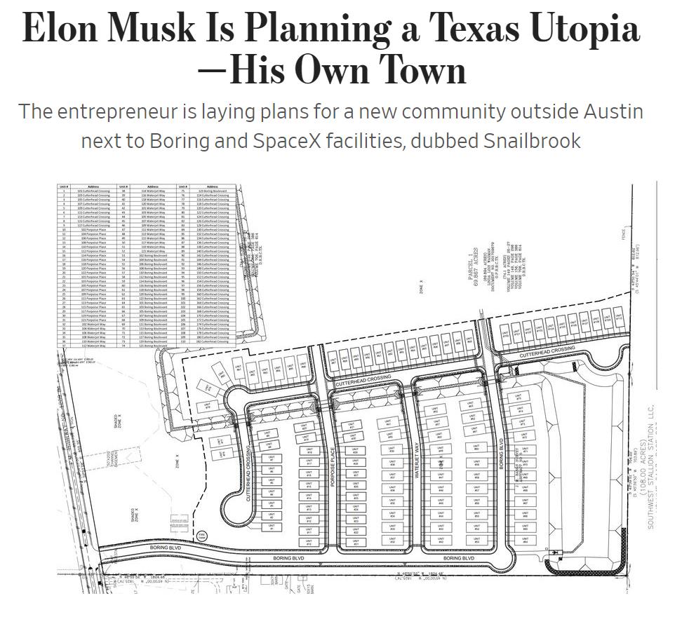 具体而言,“蜗牛溪”的计划将包括建造100多套住宅,以及游泳池、户外运动区,甚至一所小型学校等便民设施,还包括一个为马斯克建造私人住宅区的项目(可能位于城外)。根据一份内部文件,细分街道也已经被命名,包括Boring Boulevard、Cutterhead Crossing、Waterjet Way和Porpoise Place。